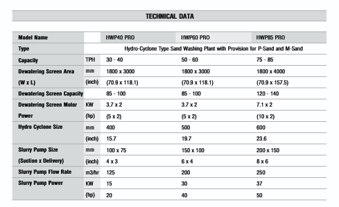 Capacity is based on 15% fines in feed material of crush sand. Capacity varies due to feed material particle size gradation. Capacity indicates maximum capacity of total slurry including water and sand. Capacity depends on the type of material, plasticity, gradation, and general flowability